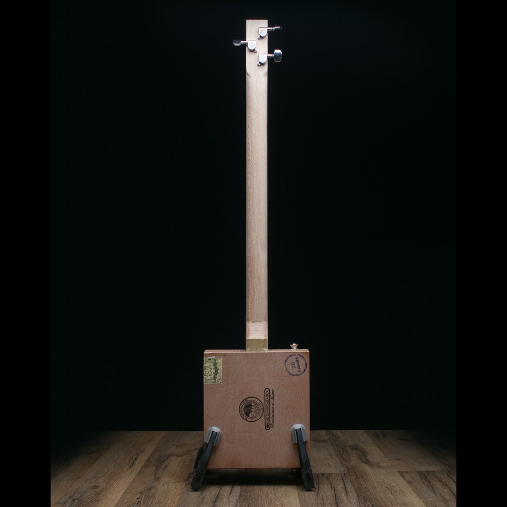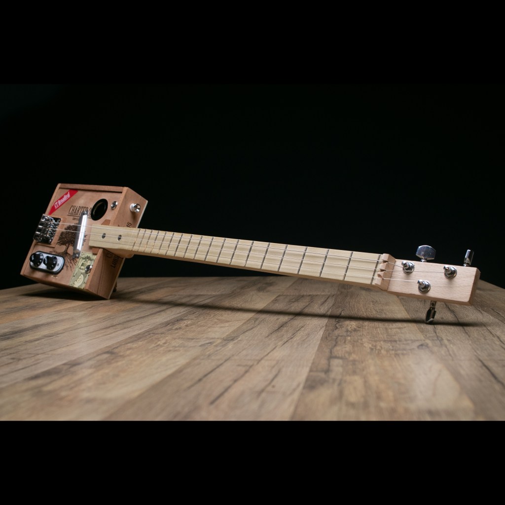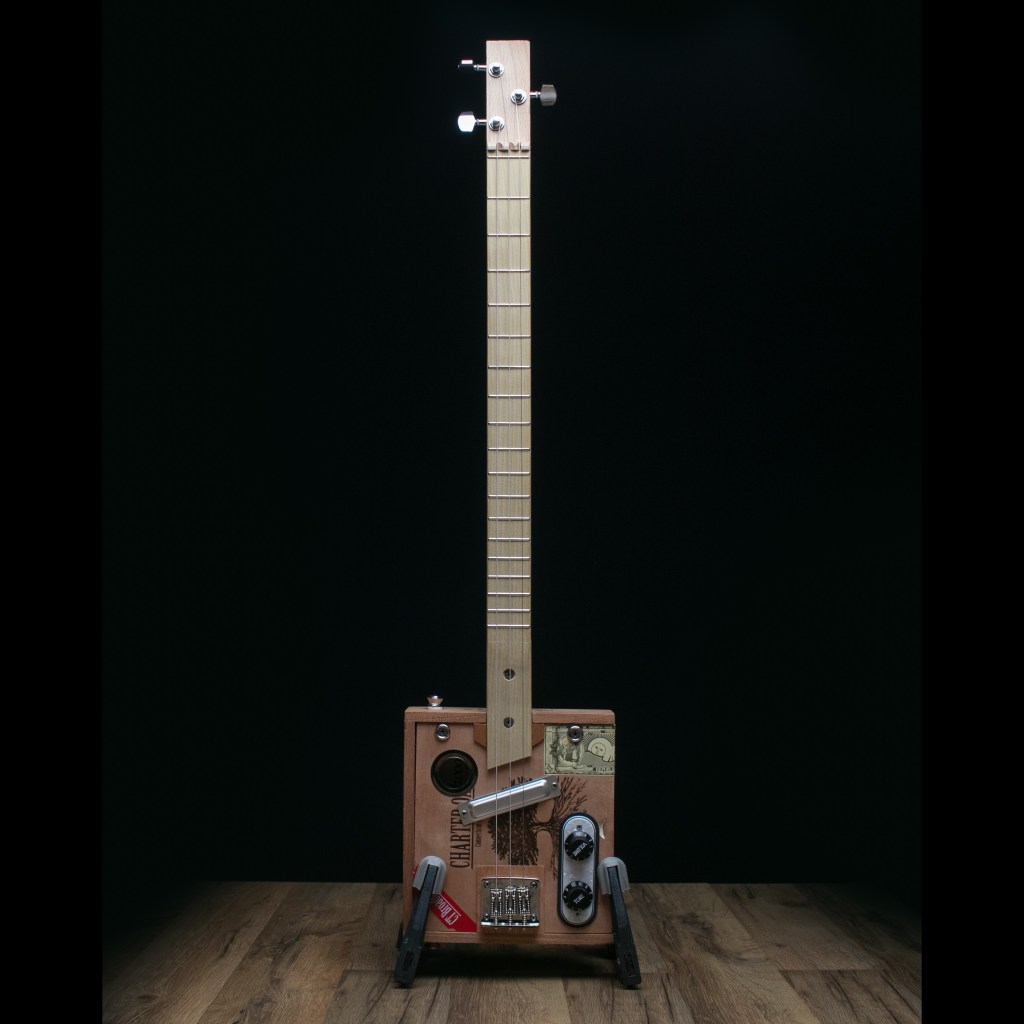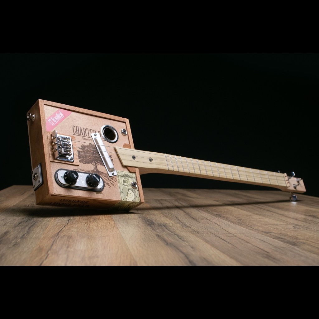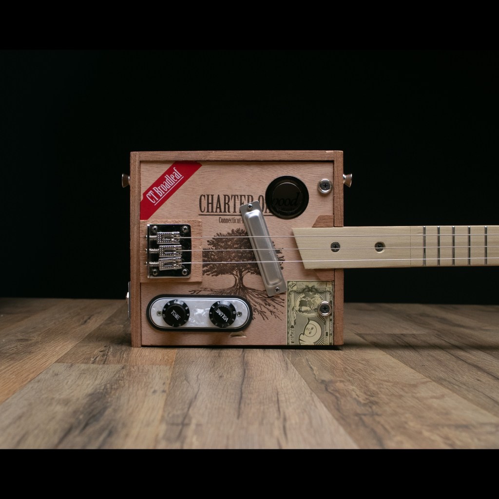 Throw down your blues licks with style using this 3-string cigar box guitar made from a Charter Oak Cigar Box. The CBG3 has a single coil MGB pickup that produces a fairly clean tone for light blues and rock. Check out the video for a sound sample.